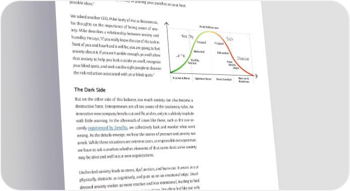 Companies need creative people engaging with each other. The right engage- ment produces the necessary friction and debate that breeds inspiration and innovative thinking. These conversations produce the creative directions that guide the company toward success. Or as Dan puts it, “Without the anxiety of these creative conversations, you may be pulling your punches on your best possible ideas.” We asked another CEO, Mike Seely of Ascus Biosciences, Peak Performance his thoughts on the importance of being aware of anx- iety. Mike describes a relationship between anxiety and Healthy Sick humility. He says, “If you really know the size of the task in Focused Fatigued front of you and how hard it will be, you are going to feel Motivated Exhaustion anxiety about it. If you are humble enough, you will allow Lame Disease Healthy Panic that anxiety to help you look outside yourself, recognize Tension Anxiety your blind spots, and seek out the right people to share in Anger the risk reduction associated with your blind spots.” Inactive & Bored Optimum Stress Stress Overload Burn-out & Breakdown The Dark Side But on the other side of this balance, too much anxiety can also become a destructive force. Entrepreneurs are all too aware of the cautionary tales. An innovative new company breaks out and flourishes, only to suddenly implode with little warning. In the aftermath of crises like these, such as the one re- cently experienced by Zenefits, we collectively look and wonder what went wrong. As the details emerge, we hear the stories of pressure and anxiety run amok. While these situations are extreme cases, as responsible entrepreneurs we have to ask ourselves whether elements of that same destructive anxiety may be alive and well in our own organizations. Unchecked anxiety leads to stress, dysfunction, and burn-out. It wears us out physically, distracts us cognitively, and puts us on an emotional edge. Unad- dressed anxiety makes us more reactive and less intentional, leading to bad decisions, avoidance, and destructive interactions. We often feel like our only option is to push through anxiety. Fearing the consequences of slowing down, we repress our turbulent inner worlds. We make excuses for the times we blow up in meetings. We ignore the physical warning signs of stress. We tell ourselves we’ll be able to sleep peacefully again, once the next round of fund- raising is over.