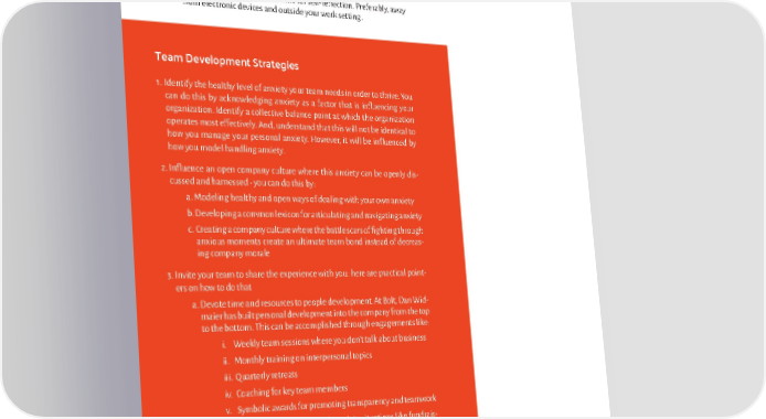 3. Devote time and energy to your personal development. a. Seek out a personal coach. b. Cultivate a network of CEOs who can speak honestly and vulnerably about their own experience. c. Set aside regular and sacred time for self-reflection. Preferably, away from electronic devices and outside your work setting. Team Development Strategies 1. Identify the healthy level of anxiety your team needs in order to thrive. You can do this by acknowledging anxiety as a factor that is influencing your organization. Identify a collective balance point at which the organization operates most effectively. And, understand that this will not be identical to how you manage your personal anxiety. However, it will be influenced by how you model handling anxiety. 2. Influence an open company culture where this anxiety can be openly dis- cussed and harnessed - you can do this by: a. Modeling healthy and open ways of dealing with your own anxiety b. Developing a common lexicon for articulating and navigating anxiety c. Creating a company culture where the battle scars of fighting through anxious moments create an ultimate team bond instead of decreas- ing company morale 3. Invite your team to share the experience with you: here are practical point- ers on how to do that a. Devote time and resources to people development. At Bolt, Dan Wid- maier has built personal development into the company from the top to the bottom. This can be accomplished through engagements like: i. Weekly team sessions where you don’t talk about business ii. Monthly training on interpersonal topics iii. Quarterly retreats iv. Coaching for key team members v. Symbolic awards for promoting transparency and teamwork b. Be proactive about addressing high anxiety situations like fundrais- ing, product launches, and team transition points by going through appropriate Board presentations with the entire company in an open forum