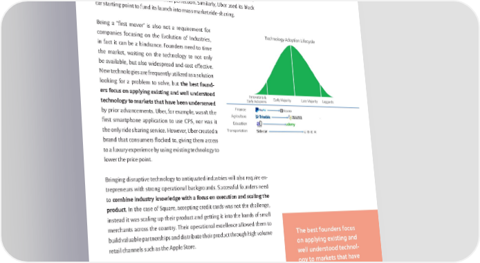 that set them apart: they are valiant operators as opposed to ardent technol- ogists. And they are obsessed with mass adoption over a particular product vision. It’s no surprise that Microsoft won over Apple in the PC battle of the 1980s because Bill Gates was obsessed with cost, which drove mass adoption, while Steve Jobs was obsessed with perfection. Similarly, Uber used its black car starting point to fund its launch into mass market ride-sharing. Being a “first mover” is also not a requirement for companies focusing on the Evolution of Industries, in fact it can be a hindrance. Founders need to time the market, waiting on the technology to not only be available, but also widespread and cost effective. New technologies are frequently utilized as a solution looking for a problem to solve, but the best found- ers focus on applying existing and well understood technology to markets that have been underserved by prior advancements. Uber, for example, wasn’t the first smartphone application to use GPS, nor was it the only ride sharing service. However, Uber created a brand that consumers flocked to, giving them access to a luxury experience by using existing technology to lower the price point. Bringing disruptive technology to antiquated industries will also require en- trepreneurs with strong operational backgrounds. Successful founders need to combine industry knowledge with a focus on execution and scaling the product. In the case of Square, accepting credit cards was not the challenge, instead it was scaling up their product and getting it into the hands of small merchants across the country. Their operational excellence allowed them to The best founders focus build valuable partnerships and distribute their product through high volume retail channels such as the Apple Store. on applying existing and well understood technol- ogy to markets that have been underserved