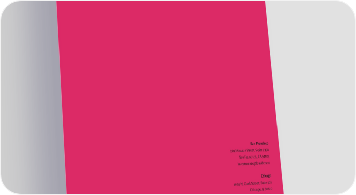 San Francisco 201 Mission Street, Suite 2350 San Francisco, CA 94105 investments@builders.vc Chicago 1165 N. Clark Street, Suite 501 Chicago, IL 60610 investments@builders.vc www.builders.vc