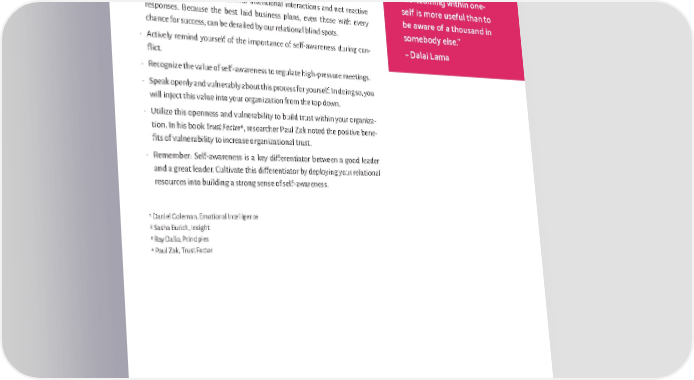 clude anger in the face of conflict, fear in the face of decisions, paralysis in the midst of chaos. You may default toward action or inaction. There is not “To be aware of a single a right or wrong set of defaults. There is only awareness and willingness to shortcoming within one- find solutions that match how you operate. • Utilize self-awareness to aim for intentional interactions and not reactive self is more useful than to responses. Because the best laid business plans, even those with every be aware of a thousand in chance for success, can be derailed by our relational blind spots. somebody else.” • Actively remind yourself of the importance of self-awareness during con- – Dalai Lama flict. • Recognize the value of self-awareness to regulate high-pressure meetings. • Speak openly and vulnerably about this process for yourself. In doing so, you will inject this value into your organization from the top down. • Utilize this openness and vulnerability to build trust within your organiza- tion. In his book Trust Factor4, researcher Paul Zak noted the positive bene- fits of vulnerability to increase organizational trust. • Remember: Self-awareness is a key differentiator between a good leader and a great leader. Cultivate this differentiator by deploying your relational resources into building a strong sense of self-awareness. 1 Daniel Goleman, Emotional Intelligence 2 Sasha Eurich, Insight 3 Ray Dalio, Principles 4 Paul Zak, Trust Factorlai Lama