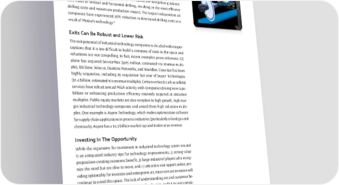 Motive Drilling is a venture backed software player in the oilfield services space. Funded by GE, Hunt Oil, and BUILDERSVC’s precursor fund Formation 8, Motive connects into the operations of existing drilling rigs to optimize di- rectional drilling decisions via data analytics, drilling dynamics, and economic modeling. The system provides turn-by-turn downhole navigation guidance over miles of vertical and horizontal drilling, resulting in the most efficient drilling costs and maximum production impact. The largest independent oil companies have experienced 50% reduction in directional drilling costs as a 4 result of Motive’s technology. Exits Can Be Robust and Lower Risk The exit potential of industrial technology companies is clouded with misper- ceptions that it is too difficult to build a company of scale in the space and valuations are not compelling. In fact, recent examples prove otherwise. GE alone has acquired ServiceMax ($915 million; estimated 10x revenue multi- ple), Bit Stew, Wise.io, Daintree Networks, and Wurldtec. Cisco too has been highly acquisitive, including its acquisition last year of Jasper Technologies ($1.4 billion; estimated 10x revenue multiple). Certain verticals such as oilfield services have robust annual M&A activity, with companies driving new capa- bilities or enhancing production efficiency routinely acquired at attractive multiples. Public equity markets are also receptive to high growth, high mar- gin industrial technology companies and award them high valuation multi- ples. One example is Aspen Technology, which makes optimization software for supply chain applications in process industries (particularly oil and gas and chemicals). Aspen has a $4.3 billion market cap and trades at 9x revenue. Investing In The Opportunity While the arguments for investment in industrial technology center around 1) an antiquated industry ripe for technology improvements, 2) strong value proposition creating economic benefit, 3) large industrial players who recog- nize the need but are slow to move, and 4) attractive exit opportunities pro- viding optionality for investors and entrepreneurs, most venture investors will continue to avoid this space. The lack of understanding around customer be- havior and the need to get out of Silicon Valley, Boston, and LA to visit compa- nies in Dallas, Detroit, and Alpharetta will deter all but those who have strong conviction in the opportunity. Navin Bhargava Jim Kim 4 http://www.motivedrilling.com/case-studies/eagle-ford-s-texas