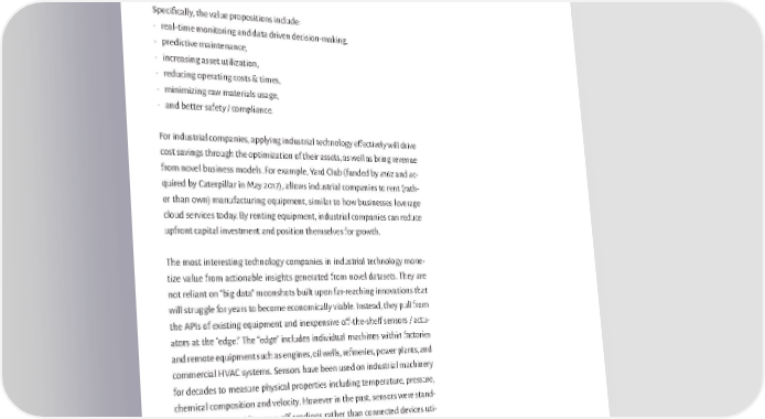 What is Industrial Tech? We define industrial technology as the application of software platforms and hardware to reduce manufacturing costs, create new capabilities, and opti- mize equipment performance. Specifically, the value propositions include: • real-time monitoring and data driven decision-making, • predictive maintenance, • increasing asset utilization, • reducing operating costs & times, • minimizing raw materials usage, • and better safety / compliance. For industrial companies, applying industrial technology effectively will drive cost savings through the optimization of their assets, as well as bring revenue from novel business models. For example, Yard Club (funded by a16z and ac- quired by Caterpillar in May 2017), allows industrial companies to rent (rath- er than own) manufacturing equipment, similar to how businesses leverage cloud services today. By renting equipment, industrial companies can reduce upfront capital investment and position themselves for growth. The most interesting technology companies in industrial technology mone- tize value from actionable insights generated from novel datasets. They are not reliant on “big data” moonshots built upon far-reaching innovations that will struggle for years to become economically viable. Instead, they pull from the APIs of existing equipment and inexpensive off-the-shelf sensors / actu- ators at the “edge.” The “edge” includes individual machines within factories and remote equipment such as engines, oil wells, refineries, power plants, and commercial HVAC systems. Sensors have been used on industrial machinery for decades to measure physical properties including temperature, pressure, chemical composition and velocity. However in the past, sensors were stand- alone devices providing one-off readings rather than connected devices uti- lized for real-time data analysis.